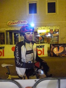 Jetzt eine kurze Pause zum Montieren der Beleuchtung für die Nacht, Kleidungswechsel und endlich was gscheits zu essen (Nudeln). Konnte nebenbei sogar noch ein Fußbad nehmen, da meine SIDI-Schuhe schon ziemlich drücken. Alles war perfekt hergerichtet, nur den Hintern mußte ich mir selbst eincremen.