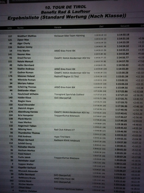 Bei der Siegerehrung wurde dann als Dritter aber leider nicht mein Name aufgerufen. Da dürfte noch kurz vorher was korrigiert worden sein und ich war schlußendlich Vierter. Da zum Schluß alles recht hektisch war,kann ichs nicht genau sagen als wievielter ich durchs Ziel fuhr, aber wird schon seine Richtigkeit haben. Auf jedenfall sind auf der Ergebnisliste einige Siegfahrer hinter mir, das hätt ich mir nicht gedacht und wirds so schnell wohl auch nicht mehr geben.