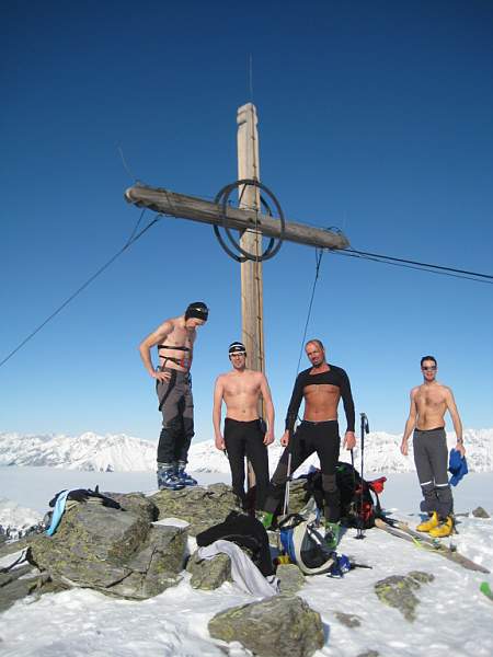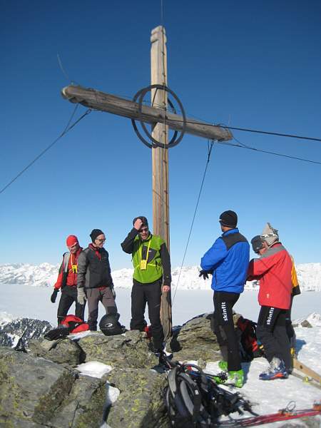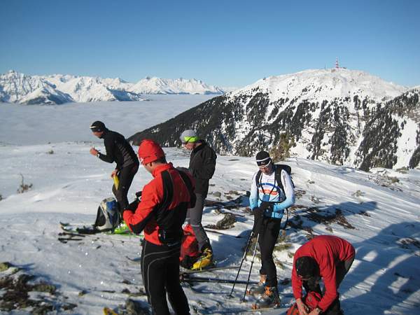 Mit einer starken Ciclofilisti Abordnung (Hr. Steilner, Angelo, Grammi, Logo, Gaston, Kermit, Roberta, Pantani) machten wir uns heute auf den Morgenkogel zu erklimmen. Da die Zufahrt zum Parkplatz Unterlarcher in Oberellbögen wg. leichter Schneefahrbahn wieder mal zu glatt war, sind wir bereits knapp über der Römerstr., auf dem Forstweg Richtung Meissner Haus aufgestiegen. Ab einer Höhe von 1800, sind wir dann über der Nebelbank gewesen und erwartete uns ein Traumskiwetter. Absolut kein Wind und angenehme Temperaturen waren die Folge. Nach längerem genüßlichen Aufenthalt am Gipfel, hatten wir dann eine gewaltige Abfahrt mit unverspurten Pullverhängen und weiter unten eine abenteuerliche Fahrt durch den dichten Wald.