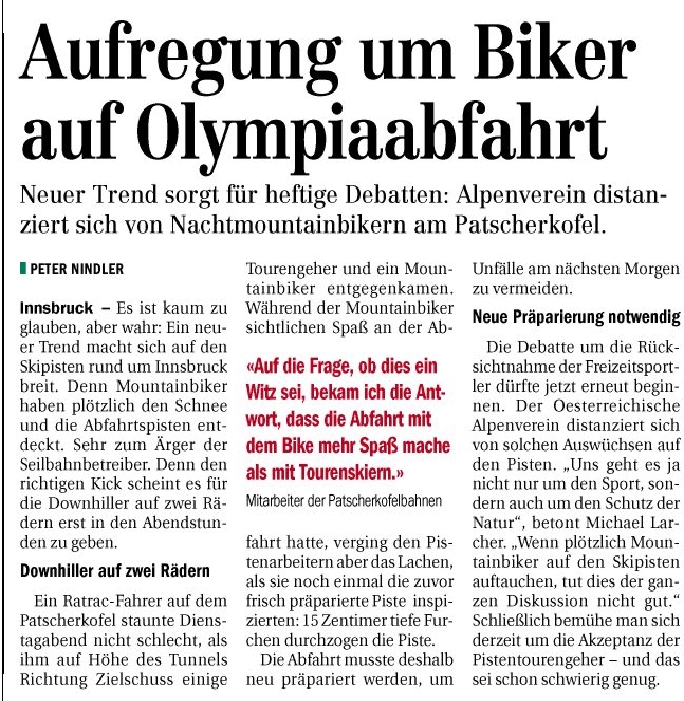 wohl nich so schnell wieder auf dem Rad sitzen werde. Doch es hat nur eine gute Woche gedauert. Konnte gestern und heute jeweils eine ausgedehnte Mittagspause machen und bin mit dem Rennrad nach Telfs. Gestern wars noch ziemlich naß auf der Straße, heute schon kaum mehr. Bis Freitag sollte es wohl überhaupt komplett trocken sein.