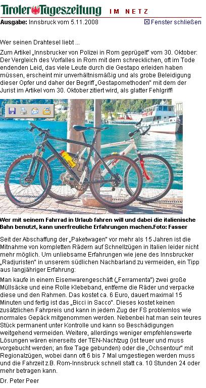 Ein interessanter Leserbrief in det TT vom 5.11.08, der beschreibt wie man am besten sein Radl in den italienischen Zügen wieder Richtung Heimat transportiert: