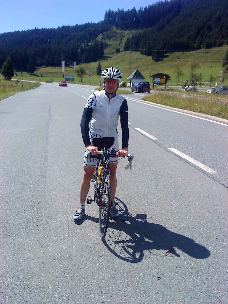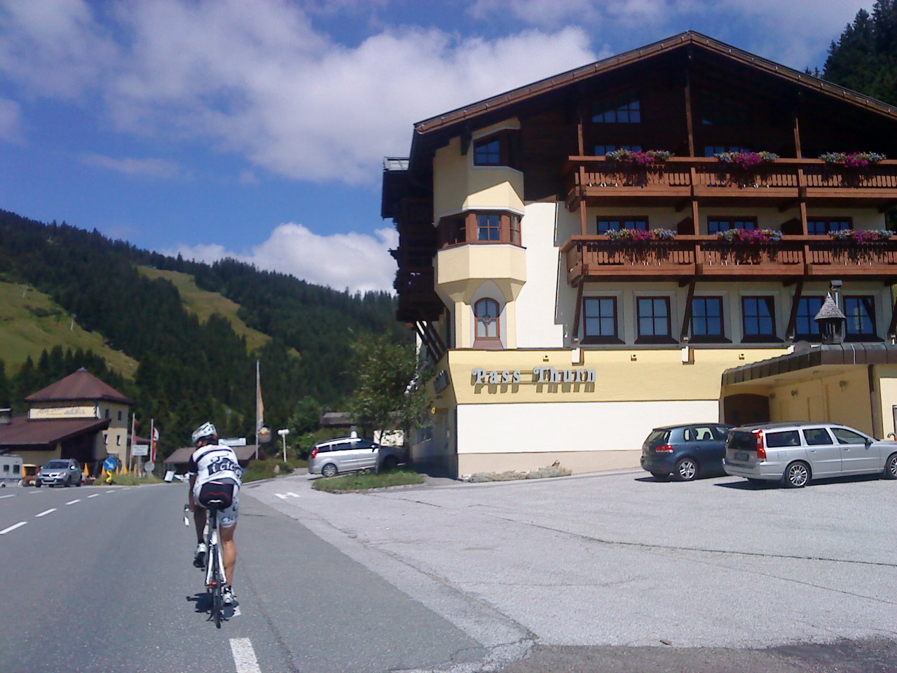 und dann im Eiltempo Richtung Pinzgau. Dann noch ca. 20 km flach bei Gegenwind durch Bramberg und nach Mittersill, wo uns der 2. Anstieg des Tages auf den Paß Thurn erwartete. Dieser Anstieg von der Steilheit her fast noch angenehmer zu fahren als die Gerlos und in rhytmischem Tempo die Paßhöhe bald erreicht.
