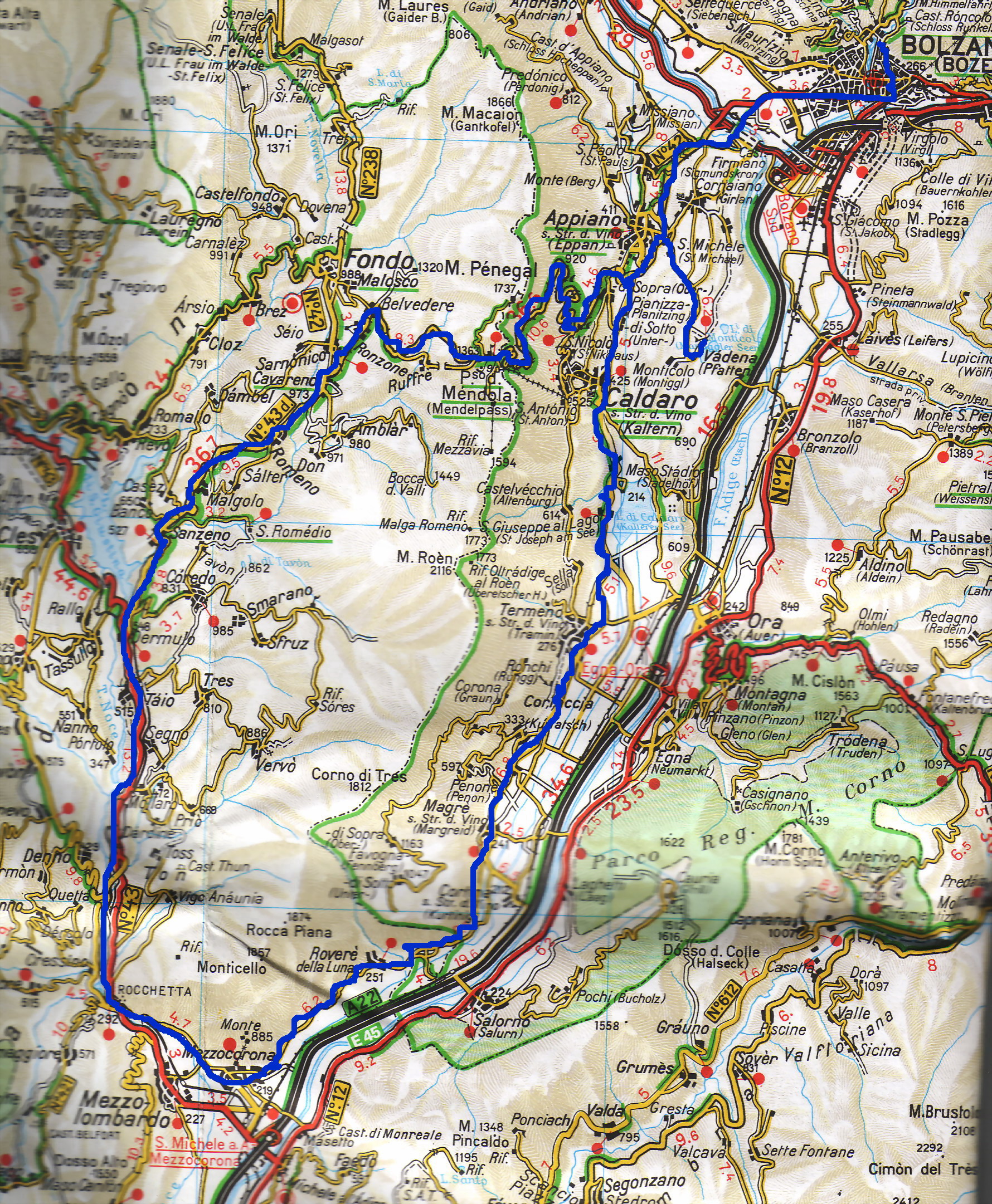 in der Ortsmitte von Mezzocorona weiter ins Val di Non, über Fondo auf den Mendelpass und dann die kurvenreiche Strecke hinunter nach St. Michele und retour nach Bozen.