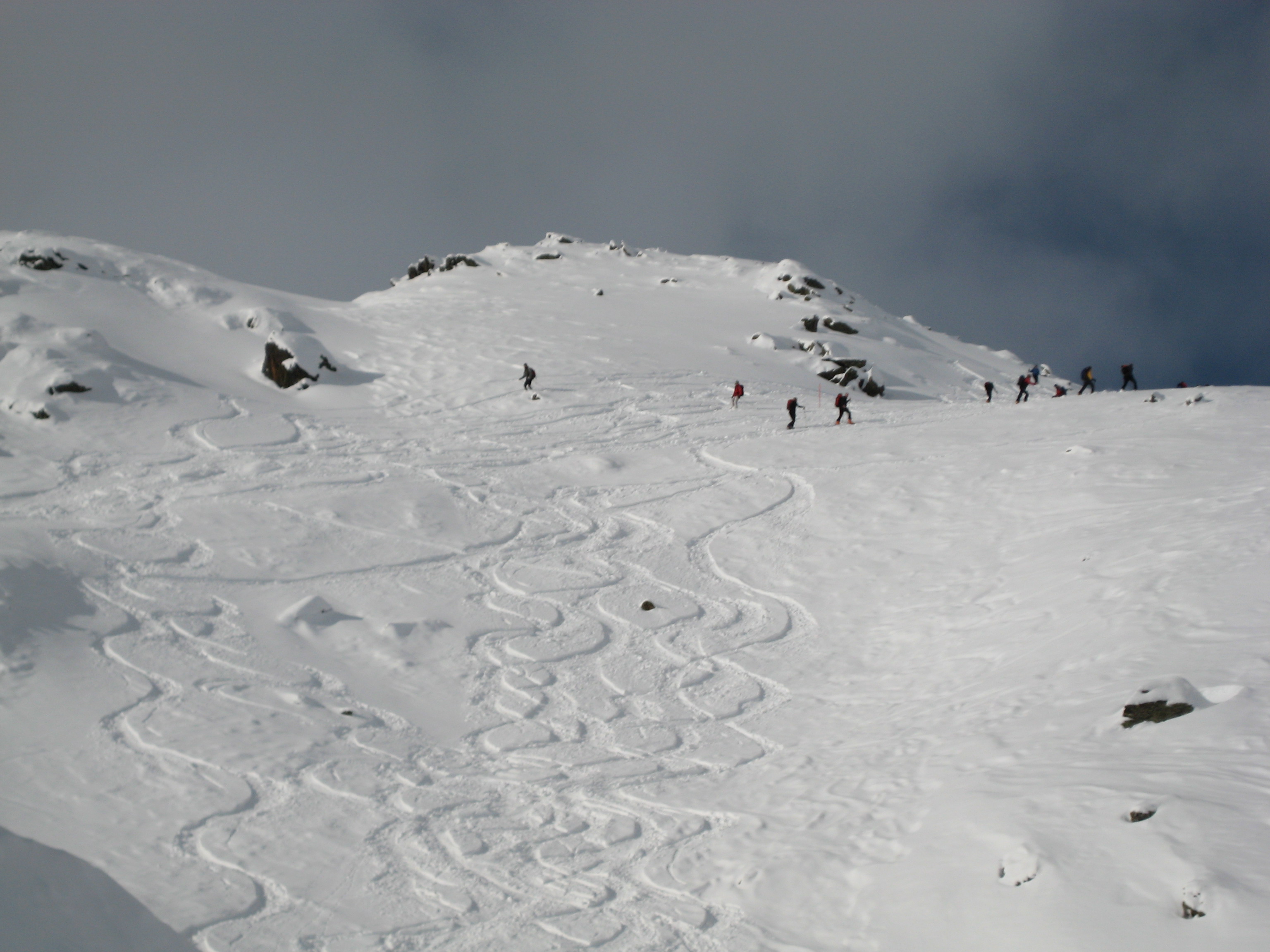 Der Neuschnee der über Nacht kam, machte Lust auf Pullverschneevergnügen. Der Neuschnee war in Praxmar und ganz oben aber fast gleich hoch mit ca. 20 – 30 cm. Allerdings war der Ansturm auf die Lampsenspitze gross. War nicht ganz einfach den eigenen Schritt zu gehen, da eine Vielzahl von Tourengehern unterwegs war und ständiges Ausweichen in den Tiefschnee notwendig war um vorbeizukommen. Beim Abfahren war allerdings genug frei, um noch eine eigene Spur ziehen zu können.